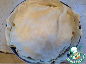 Раскатываем меньшую часть по размеру формы и прикрываем начинку.