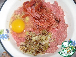 Я взяла смешанный фарш (говядина, свинина, куриное филе). В фарш добавляем яйцо, соевый соус, черный перец, лук, чеснок, томатную пасту.