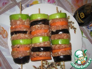 На шпажки поочередно нанизывать кружок кабачка-фарш-кружок моркови-фарш-баклажан и т. д. Первым и последним должен быть кружок овоща. Фарш формовать по окружности овощей.