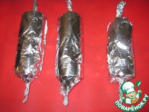 На куски фольги выложить шашлычки и завернуть в форме конфеты. Запекать в духовке 30 минут при t=200С.