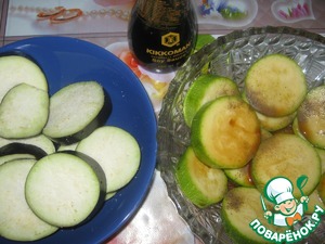 Кабачок нарезать кружочками 1,5 см, полить соевым соусом Киккоман, поперчить, перемешать. Баклажан нарезать кружками, посолить.