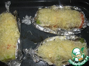 По истечении 30 минут достать "конфетки" из духовки, развернуть фольгу, смазать немного майонезом (можно и не мазать, кому как нравится), посыпать тертым сыром и поставить в духовку ещё на 5 минут.