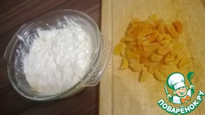 В творог добавляем сахар, ванильный сахар, яйца, курагу; перемешиваем. -