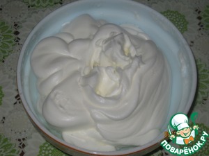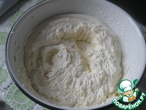 Белки отделяем от желтков. Соединяем желтки и 70г сахара. Взбиваем в пышную пену и увеличения массы в двое.