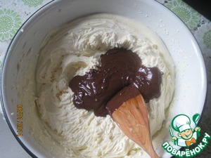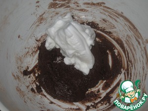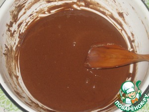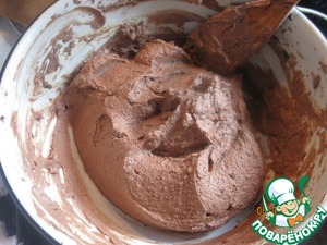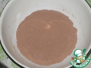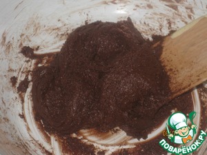 Полученную массу соединяем с мукой, какао и разрыхлителем. Получается довольно густое тесто.