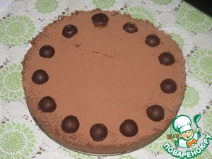 По прошествии положенного времени, достаем торт из холодильника, снимаем форму. Посыпаем какао и украшаем любимыми конфетами.