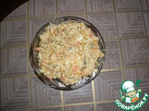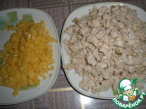 Морковь и яйца отварить, остудить, очистить, порезать мелкими кубиками.
