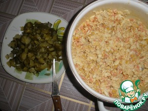 Огурцы порезать мелкими кубиками и добавить к остальным продуктам... этот салат можно готовить и без огурчиков, он получается более нежный, но на праздник и как закуска под водочку с огурчиками будет именно то)))