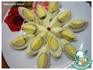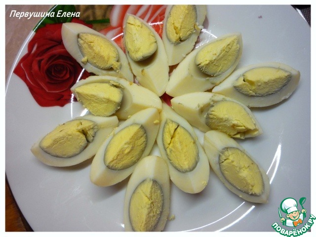 Куриные яйца разрезаем на четвертинки и выкладываем на блюдо.
