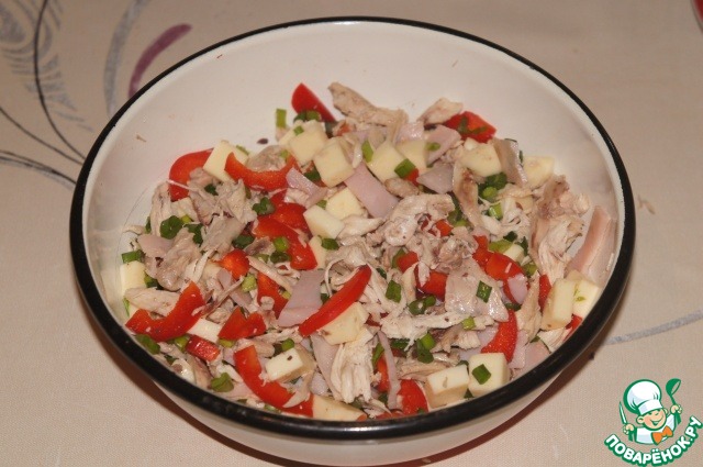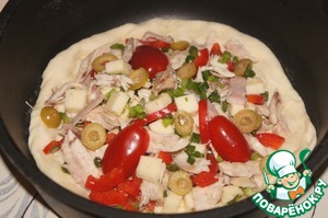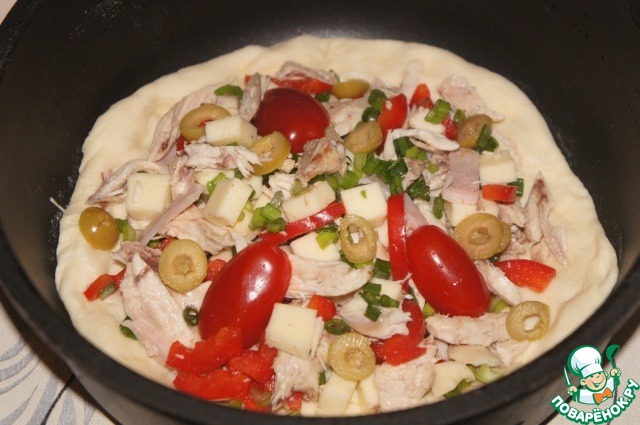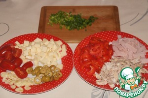 Тем временем подготовить продукты из того, что найдете дома. Я нарезала кусочек ветчины, растрепала мясо курицы, нарезала перец лапшой, оливки - колечками, чеснок - пластинками, сыр (у меня сулугуни) - кубиками. Зеленый лук измельчила.