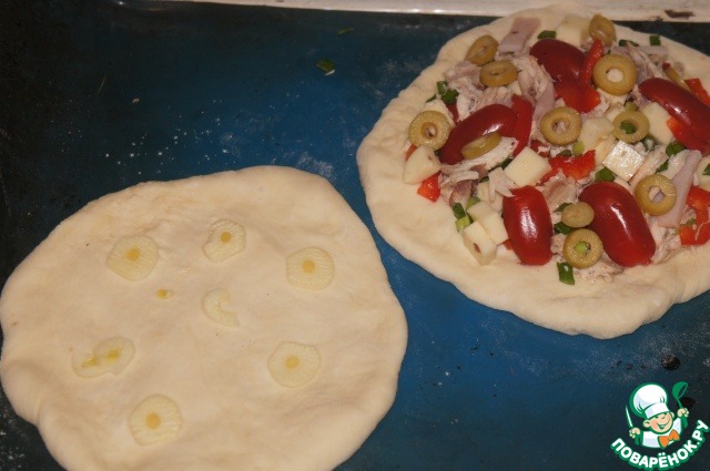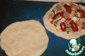 Тесто разделить на порции и размять руками или слегка раскатать. Раскидать пластинки чеснока.