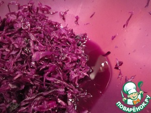 Хорошо отжать, посыпать щепоткой соли, сбрызнуть лимонным соком, перетереть руками до появления синего сока.