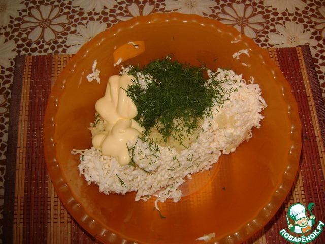 Соединяем натёртые сыр, чеснок, укроп, майонез. Всё хорошо перемешиваем.
