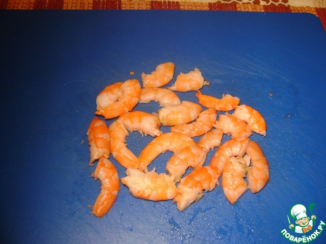 Креветки предварительно отварить до готовности в подсоленной воде, очистить. У меня были королевские креветки, поэтому я разрезала каждую пополам для удобства приготовления.