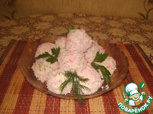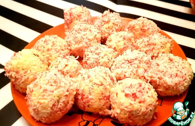 Берем каждый шарик и обваливаем его в натёртых крабовых палочках.
