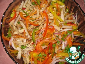 Перцы нарезать очень тонкой соломкой, морковь натереть на корейской терке, лук нарезать соломкой.