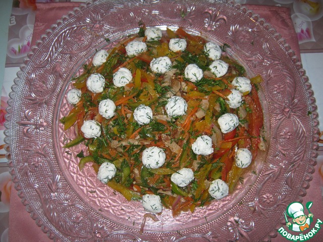 Рецепт «Салат "Пирамида с мясом, перцем и сырными шариками"»: