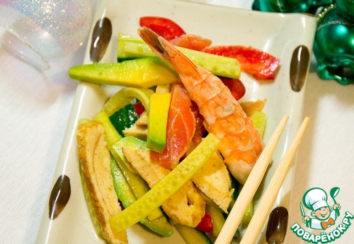 Нарезать ингредиенты соломкой (огурец, авокадо, перец, семга, омлет). Добавить чайную ложку рисового уксуса и 2 столовых соевого соуса. Перемешать.