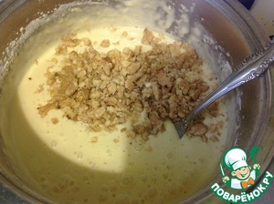 • Грецкие орехи прокатываем скалкой не очень мелко и добавляем в тесто, аккуратно перемешиваем