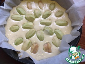 • Фейхоа чистим от кожуры и режем пополам. Форму выстелаем пекарской бумагой и выкладываем тесто. Сверху выкладываем фейхоа и отправляем пирог в духовку на 40 мин при 180 гр