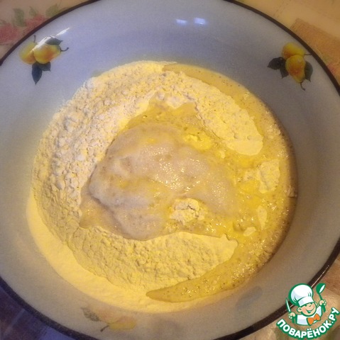 А пока займемся тестом. В 150 г теплой воды разводим дрожжи и сахар. Оставляем минут на 10, пока поднимется пенная шапочка. Просеиваем муку. Муки может понадобиться больше или меньше. Делаем в муке углубление, добавляем примерно 1,5 ч. л. соли (тут как раз такой случай, когда лучше пересолить, чем недосолить), вливаем дрожжи, теплый кефир и оставшуюся теплую воду.