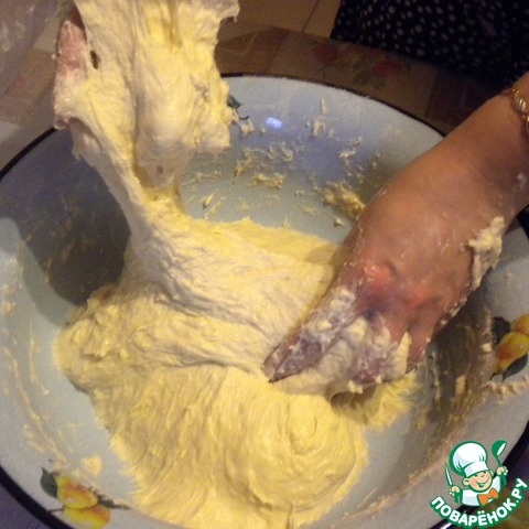 Переворачиваем и начинаем рукам растягивать пирог.