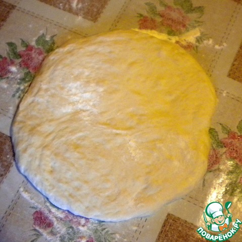 Берем один шарик теста, выкладываем его на посыпанный мукой стол. Руками формируем лепешку, примерно 20 см в диаметре, и оставляем ее отдохнуть минут на 5-10.