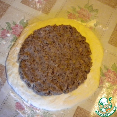 Берем шарик начинки. Надо заметить, что в осетинских пирогах количество теста и начинки должно быть одинаковым. Из начинки формируем лепешку меньшего, чем тесто, размера (примерно на 3 см с каждой стороны) и укладываем на тесто.