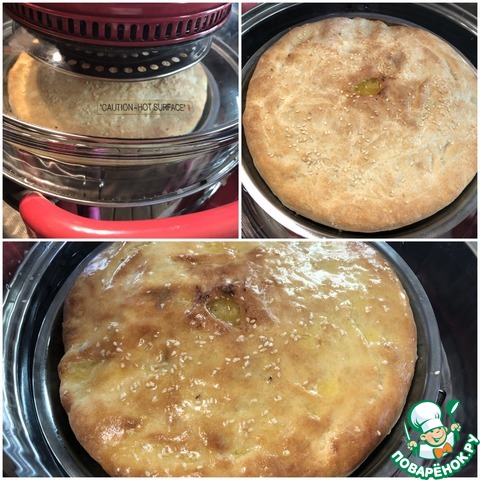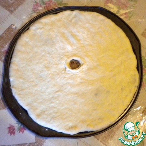 Аккуратно переносим на противень, немного смазанный постным маслом. Я использую формочку для пиццы диаметром 33 см. Вообще, размер осетинских пирогов 30-35 см. Руками формируем круглый пирог. В середине пальцами делаем небольшое отверстие для выхода пара.