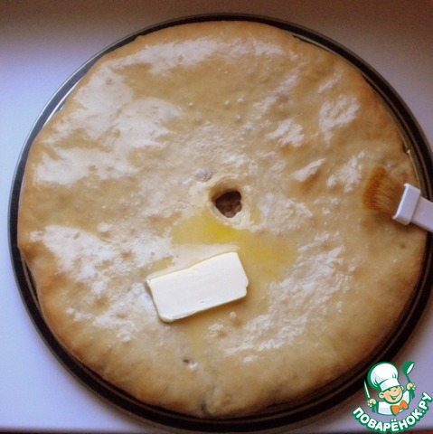 Готовый пирог кажется немного жестковатым. Обильно смазываем его сливочным маслом, особенно тщательно смазываем края пирога. Пирог пропитается маслом и станет очень мягким. На каждый пирог я беру примерно 30 г сливочного масла.