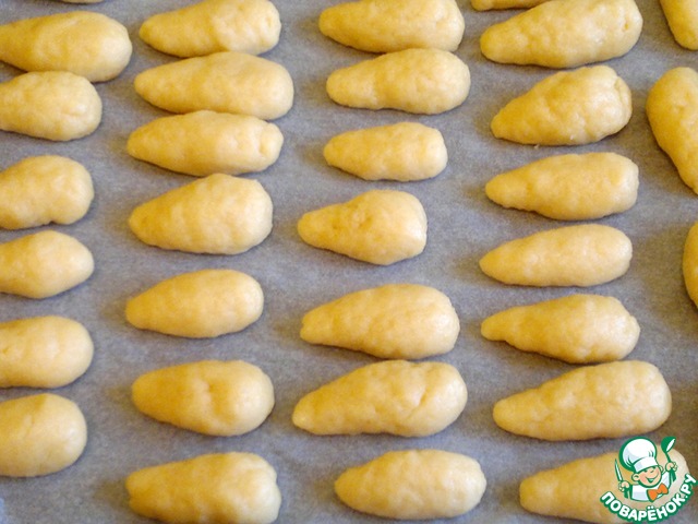 Разделите тесто на две равные части. Из одной части печь ножки - с одной стороны заострённые. Выпекать в предварительно разогретой духовке 15 минут.