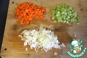Лук, морковь, чеснок и сельдерей мелко нарезать. Затем добавить лук, чеснок, морковь и сельдерей к колбаскам и слегка обжарить.