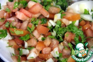 Готовим пико де галльо (the pico de gallo). Это мексиканский соус. Для этого измельчаем помидор, 1/4 лука и петрушку. Добавляем лимонный сок и соль по вкусу и хорошо перемешиваем.