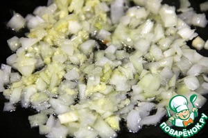Оставшийся лук мелко режем. На сковороде пассеруем лук и мелко нарезанный чеснок с добавлением оливкового масла. Около 2 минут.