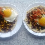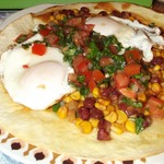 На тарелку кладем тортильяс, сверху немного сыра, затем фасоль и яйцо. Сверху добавляем немного пико де галльо.