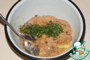 Добавить яйцо и 2 ст. л. мелко нарезанной кинзы. Снова вымесить фарш и немного выбить его.