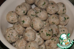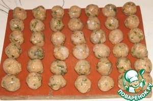 Влажными руками скатать маленькие фрикадельки (я беру буквально по половине чайной ложки фарша), выложить на доску и убрать на холод.