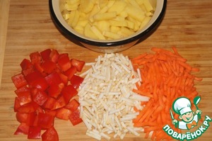 Овощи вымыть и очистить. Морковь и сельдерей нашинковать соломкой, перец нарезать небольшими квадратиками, картофель - брусочками.