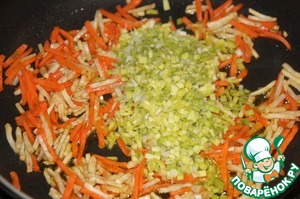 В сковороде разогреть 1 ст. л. растительного масла и обжарить до полуготовности морковь с сельдереем,