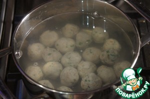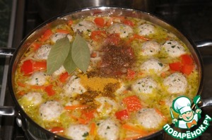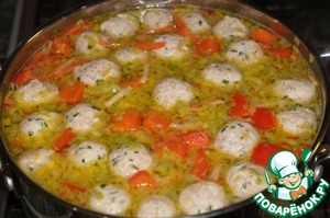 Фрикадельки снова довести до кипения, убавить огонь и варить суп еще 5 минут.
