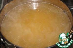 В кипящий бульон опустить картофель, довести до кипения и варить на маленьком огне 5 минут.