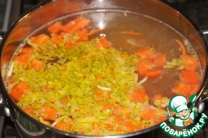 Всыпать порей и пассеровать еще 1 минуту. Отставить.
