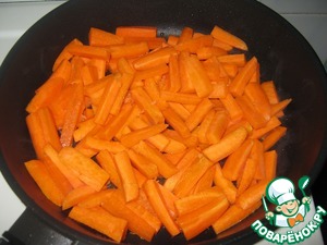 Морковь нарезать брусочками по 4-5 см длиной. Обжарить на растительном масле на среднем огне минут пять.