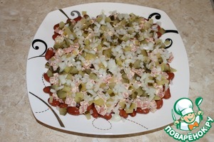 Мелко нарезанный маринованный в уксусе лук смешать с мелко нарезанными огурчиками и выложить третьим слоем.