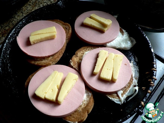Лопаткой переворачиваем бутерброд с яйцом в середине, сверху на него кладем колбасу, сыр и накрываем крышкой (для твердых сыров, чтобы сыр расплавился). Варианты могут быть в разные - в оригинале сыр выкладывался на лист салата... Здесь можно фантазировать, как угодно.