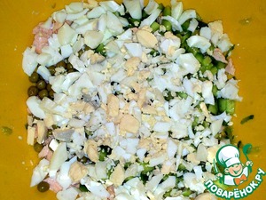 Посолить, поперчить и всё перемешать. Лук репчатый и зелёный добавить только перед подачей, иначе он будет горьким и неприятным на вкус. Заправить майонезом тоже перед подачей.
