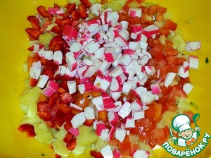 В ёмкость ко всему добавить некрупно нарезанные крабовые палочки.