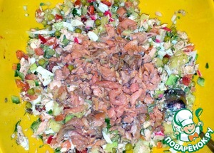 Добавить измельчённый укроп и нарезанный копчёный лосось.