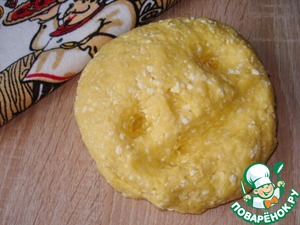 В муку, смешанную с разрыхлителем, добавим размягченное сливочное масло, творог (у меня был крупинками), яйцо, 2 ст. ложки сахара и замесим мягкое тесто.
