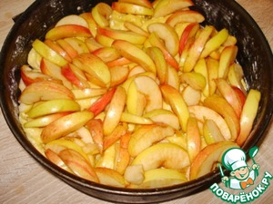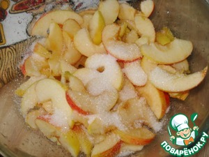 Яблоки нарезаем ломтиками, не очищая, смешиваем с сахаром и поливаем апельсиновым или лимонным соком. Даем постоять минут 30.